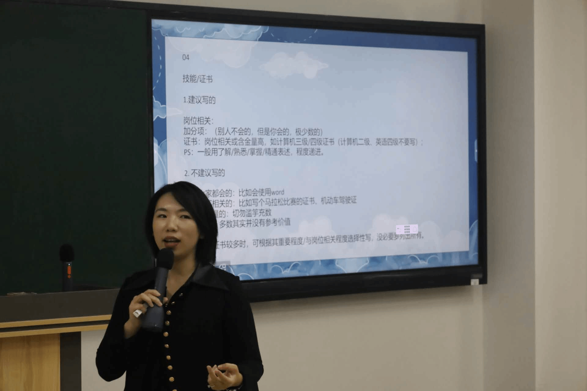 随后,闫老师向同学们讲解了简历模板、写作技巧及常见问题的解决方案,鼓励同学们多渠道投递简历,通过实习、实践磨练自我,为自己的简历增加闪光点。